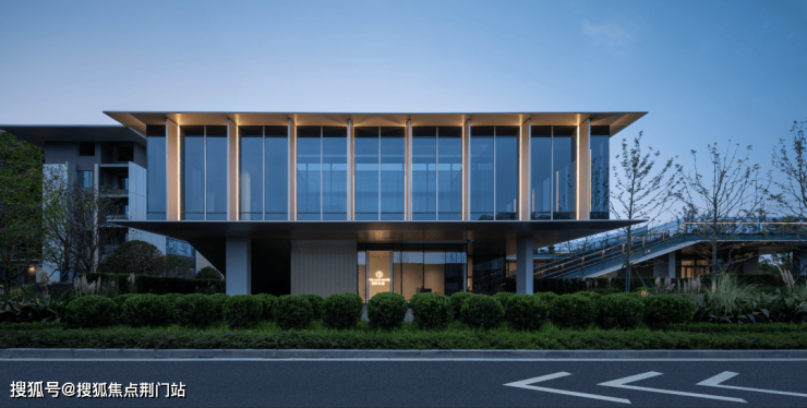 步出江东二路站不到百米, 一个轻盈的巨型悬挑玻璃盒子映入眼帘。它是湖与舍的湖岸生活馆,未来是人行主入口。涟漪水景漫铺于娜塔栎树下,更可上到眺台凭湖临风。
