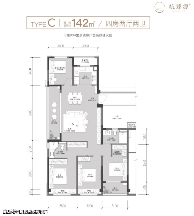 该户型为项目的较大改善户型,建面约142方,为四房两厅两卫的设计。