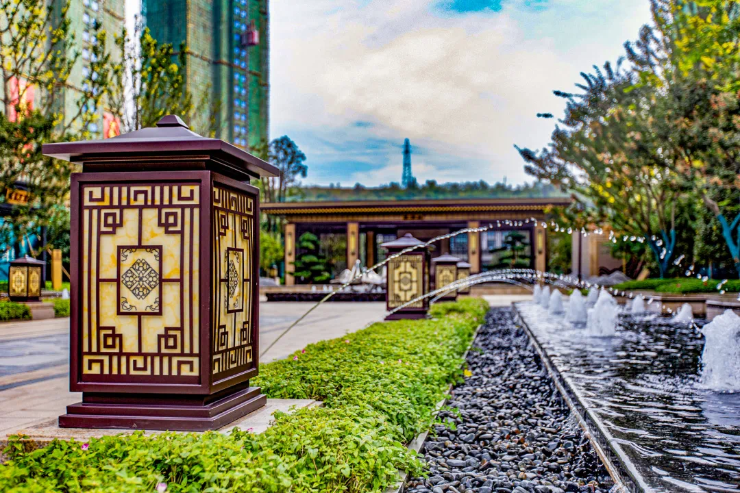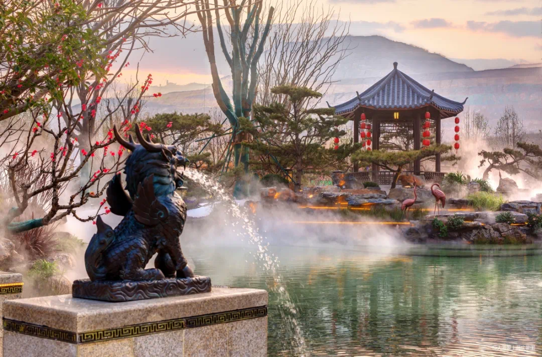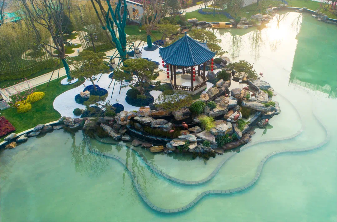 自古水能聚财,风水之法,得水之上,整个园林以水景为中心设计,达到“一路财运亨通”的寓意。