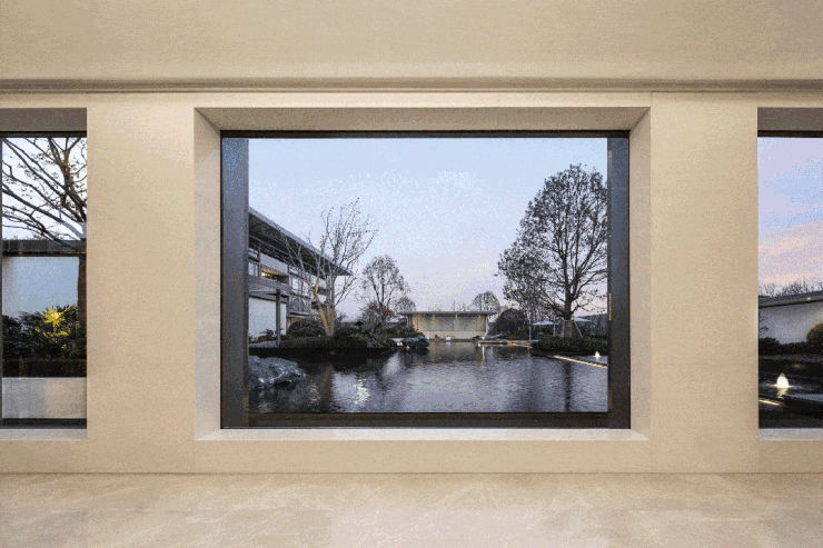 透过业主大堂,正中一面约3.6×4.8米的巨型玻璃,贝金米黄石材和仿古铜斜切出“画框”。可观约1000方镜面水系;风雨连廊更是升级为风雨游廊,步步赏景……