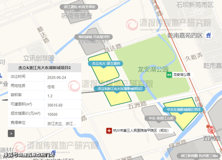 2025年6月24日,浙江杰立房地产开发有限公司、杭州承弘置业有限公司(浙江杰立&浙江光大建设集团)以总价32147万元竞得五洲路与顺意路交汇西北地块,成交楼面价为10500元/㎡,溢价率为0.0%。