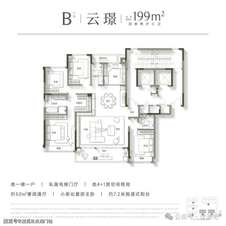B户型主要分布在2幢和3幢,除了私属电梯门厅以外,B户型的格局上也更加突破,打造类4+1房的空间格局,主卧套房设计,预留独立衣帽间空间,整体约50㎡的奢阔通厅,可满足三代同堂居住需求,南向约7.2m跑道式阳台也让整个餐客厅空间更显阔绰。