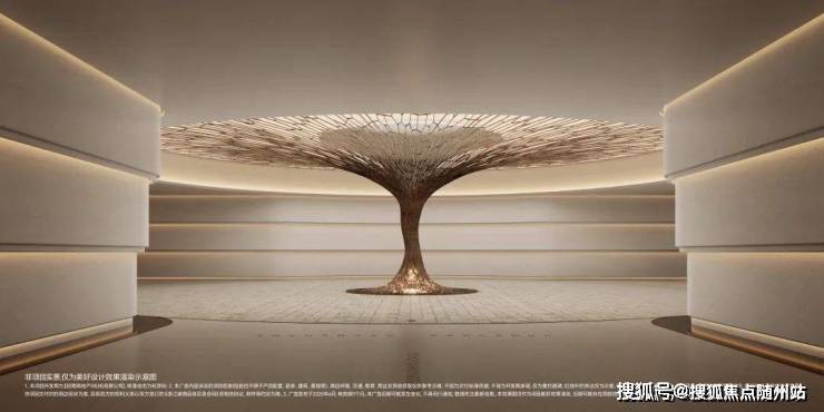 负一层多功能会所空间和中央车站相连接,以一颗造价百万的艺术造型的“黄金树”作为通往地下会所的空间过渡,与地上天光云廊的归家乔木相倒映,形成地面与地下的双归家仪式感与尊贵感。