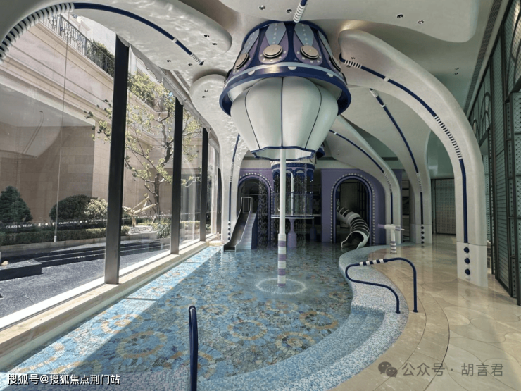 上面是地上会所,还有一个地下会所,层高8米多。层高一旦上去,许多功能空间就显得尤为大气,比如这个泳池,而且还做了屋顶采光。