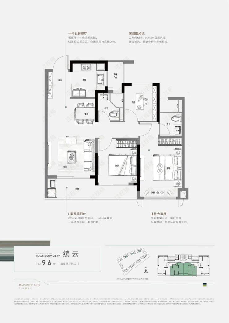 像建面约96㎡户型,整体三开间朝南设计,约9.8m奢阔尺度,户型方正大气,明亮通透,动静分区,再加上约6.6米开阔L型阳台,轻松实现一半洗衣晾晒、一般诗意生活的美妙画境。