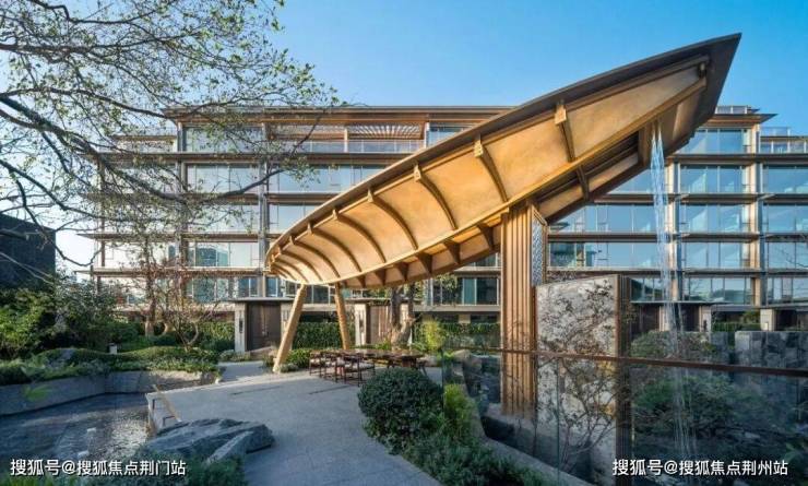 运河樾的园林感,几乎从门头就开始了:贯穿的水系、奢石景墙之上的玉石飘带,都像是把运河的水给引了过来,再配上金色的坡屋顶,很有江南院落的雅贵气质。