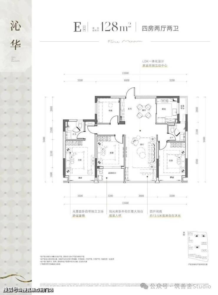 建筑面积约128平方米的四室两厅双卫户型,设计巧妙,四开间均朝南,配备私密式阳台,享受充足的南向自然光照,营造出开阔而明亮的居住空间。