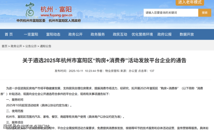 全知道了解到,这个消息的源头是10月11日杭州市富阳区人民政府官网发布的《关于遴选2025年杭州市富阳区“购房+消费券”活动发放平台企业的通告》(以下简称《通告》)。