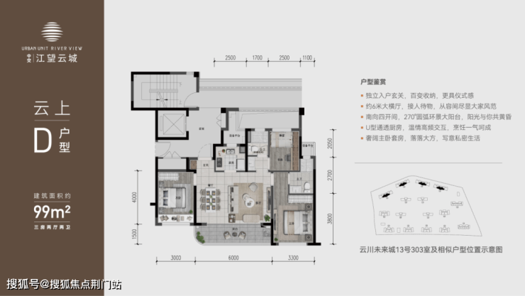 建筑面积约99㎡精奢三房,是中交·江望云城的主推户型。四开间朝南,约6米圆弧阳台揽景,三面环景视野开阔。全明户型,阔绰大横厅,媲美百余方户型的奢阔感,主卧套房设计,兼顾舒适与私密,重新定义品质生活。