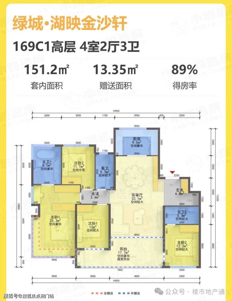 4)169方,南厅户型:4房2厅3卫,得房率89%