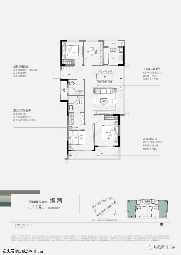 整盘共规划有11幢高层住宅,北地块712户,南地块236户,1期(北地块)3个户型,规划建面约96-130㎡都会综合体住品,最小约96㎡三室两厅两卫、其次约115㎡四室两厅两卫,最大约130㎡四房两厅两卫,精装限价2.13万/㎡(含3000元/㎡装修),含中央空调、主卧智能马桶、地暖(厨房、卫生间无)、洗碗机、客厅电视背景墙、墙布等精装一步到位,首置即改善。