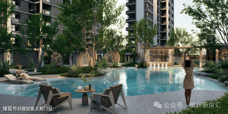 正是绿城首度落地的3.0泳池综合体。这一空间位于社区核心,归家必经之路上,融合中心泳池、林下客厅、卡座与廊架,成为串联生活场景的视觉与功能中心。