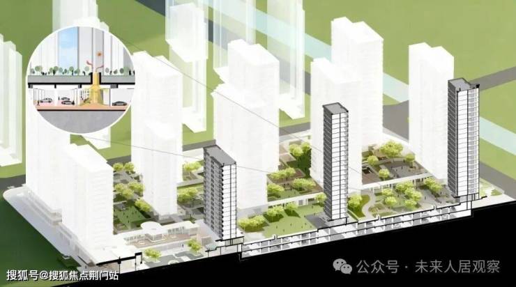 为打破城市与社区的边界隔阂,项目以 「超级底盘」 理念重新构建社区基底。通过整体抬升地下车库、融合轨道交通站点与商业配套,把地下空间升级为复合型垂直活力枢纽。