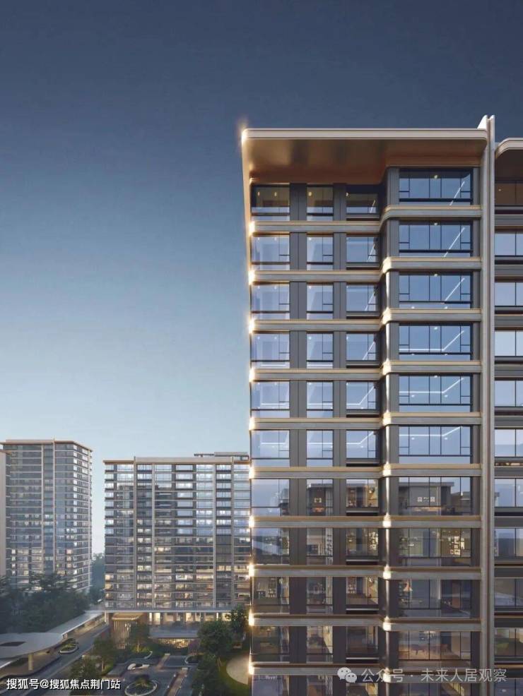 建筑立面在选材上兼顾先锋未来感与高端质感,选用Low-E 中空玻璃保证通透采光与开阔视野,搭配贝金米黄铝板,以现代精工塑造利落挺拔的建筑线条;局部点缀深灰色金属格栅与科技感灯带,在丰富立面层次的同时,呼应未来科技城的科创底色,真正做到未来形制,质感呈现。
