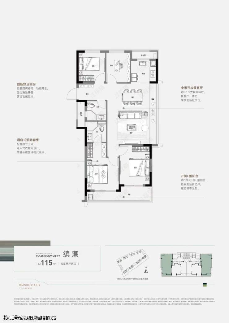 建面约115㎡边套四房,全景开放式餐客厅,有约6.1米的飘窗;南向约6.3米开阔L型阳台,观景、晾晒皆宜;套房式主卧,日常栖居温馨舒适。