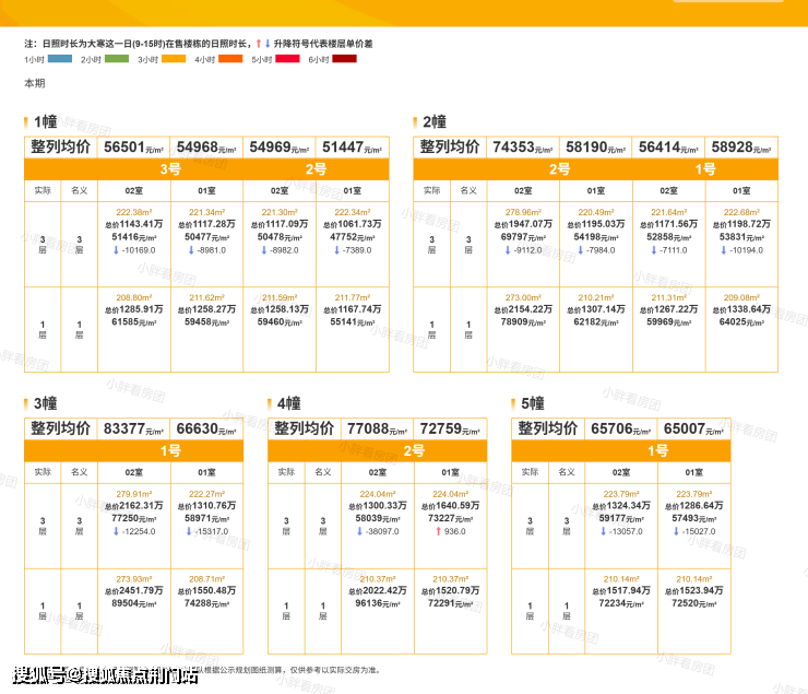 具体来看:1幢8套房源,均价54354元/㎡;2幢8套房源,均价62681元/㎡;3幢4套,均价75905元/㎡;4幢4套,均价74631元/㎡;5幢4套,均价65135元/㎡.