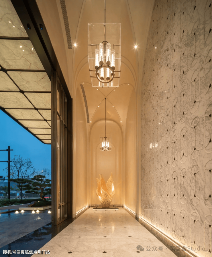 步入此境,眼前即刻展开的是一幅精致的景观水系画卷。流水潺潺,与周围的翠绿植被交相辉映,勾勒出一幅生机勃勃的画面。循水而行,连廊曲折迂回,既为业主提供了避风躲雨的便捷,又营造出一种充满仪式感的回家之路。