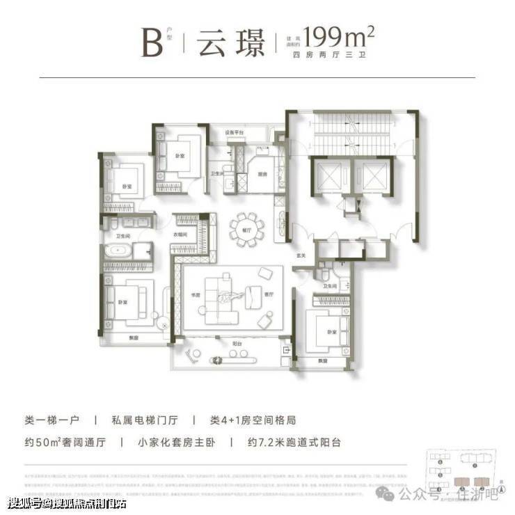 B户型主要分布在2幢和3幢,除了私属电梯门厅以外,B户型的格局上也更加突破,打造类4+1房的空间格局,主卧套房设计,预留独立衣帽间空间,整体约50㎡的奢阔通厅,可满足三代同堂居住需求,南向约7.2m跑道式阳台也让整个餐客厅空间更显阔绰。