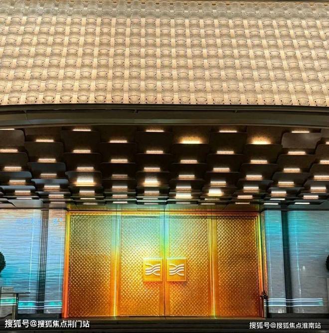 你看社区大门宽约46米,高约9米,灵感源自“京杭大运河博物馆”设计,顶部大约2280块水晶瓦精心雕琢,内部超300块金鳞铝板手工拼接,还有层叠水景,整个一看就贵气。