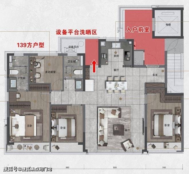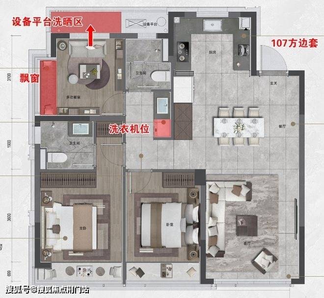 第二点是设备平台利用,公建化阳台算全面积后,以阳台室内化设计为主流。弊端是面临洗衣晾晒问题。设备平台出入口设置在餐厅,进出方便,空间足够放下洗漱池和洗衣机。