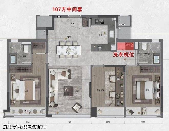 第三点是洗衣机位,三室户型很难利用设备平台,洗衣机位放到卫生间位置,可以解决生活所需,又不影响阳台美观。