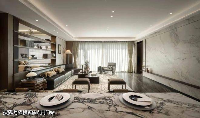 示范区洽谈区,简约大气的实木家具搭配质感细腻的皮革坐垫,艺术感十足的吊灯洒下柔和暖光,墙壁上点缀着几幅意境深远的现代画作。整体装饰尽显低调奢华,营造出优雅宁静氛围,供业主感受新贵人生的品质与惬意。