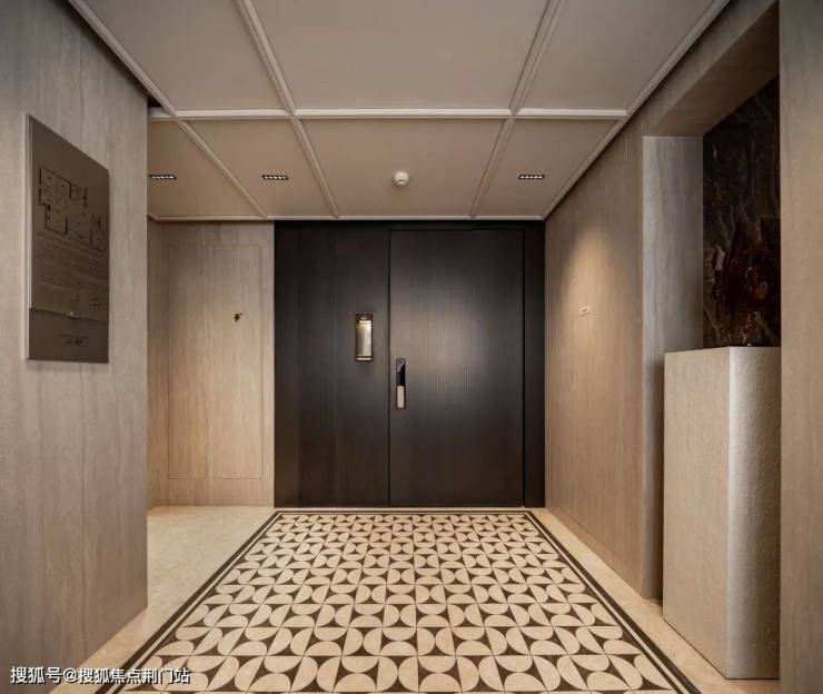 在细节上,同样暗藏无数巧思。入户门旁的“艺术壁龛门牌”、艺术木饰面、主卧拼花地板、空调进风口镂花工艺、定制编织门把手、无痕的内圆倒角吊顶……