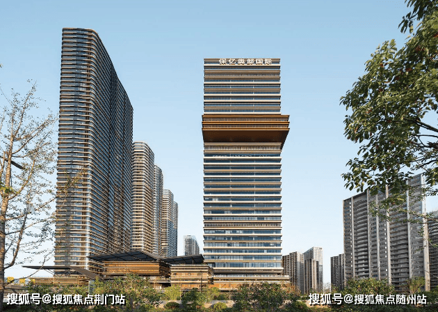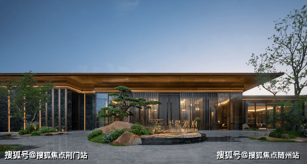 铝板 + 天然石材 + 三玻两腔玻璃,现代东方美学,暖银色主调,横向金色线条点缀。