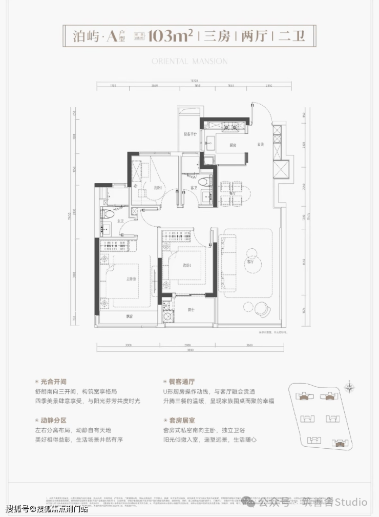 建面约103平米户型,三房两厅两卫,空间布局合理,功能齐全。南向三开间设计,朝南次卧配备阳台,客厅与阳台相连,空间更显宽敞明亮; U型厨房采用半开放式设计,玄关巧妙融入S墙冰箱位,空间利用率高,采光更佳;新规户型得房率高达约90%以上,实用性强。