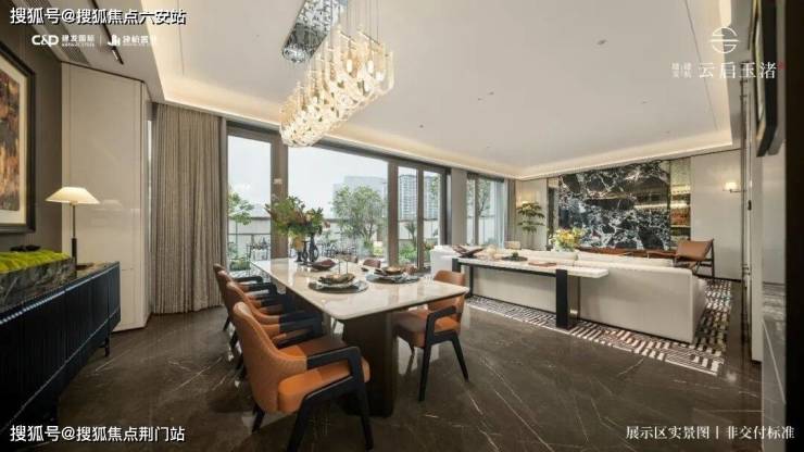 以建面约290㎡排屋样板房为例,玄关处黑白拼花地面,构成几何秩序的序厅;深色皮革墙面与古铜金属勾勒出沉稳质感;玉琮纹样、良渚图腾等文化符号,被巧妙转译为现代装饰细节。整个空间在“海派风情”与“东方意境”之间取得精妙平衡,不张扬,却见格调。欢迎拨打售楼处电话:400-018-7969转444(有专业顾问为您一对一讲解)
