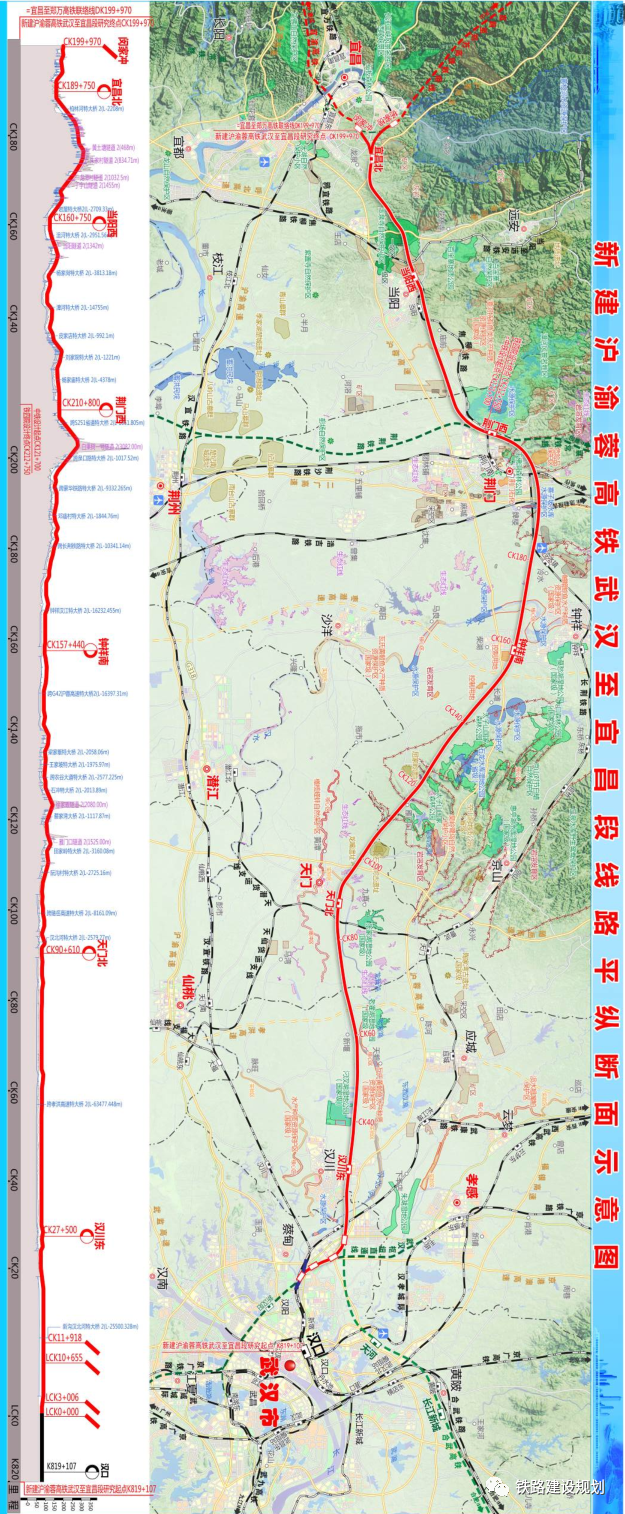 沿江高铁武汉至宜昌段,线路起自汉口站,利用汉宜铁路17.9公里设线路所新建线路向西,经汉川、天门、钟祥、荆门至宜昌,接入宜昌至郑万高铁联络线闵家冲线路所。