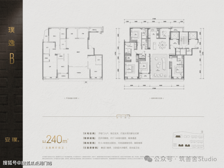 240㎡户型为5房三套房,四开间朝南,面宽达17米,客厅与卧室采光效果极佳,居住舒适度显著提升。