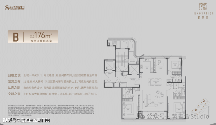 176平方米的中间户型,专为追求南北通风的家庭量身打造。宽敞的南向开间设计,确保充足的自然采光;南北双套房均朝南而向,为主人营造舒适的居住体验。更值得一提的是,主卧卫生间配置了市面上通常仅200平方米以上户型才有的豪华浴缸,彰显尊贵生活品质。