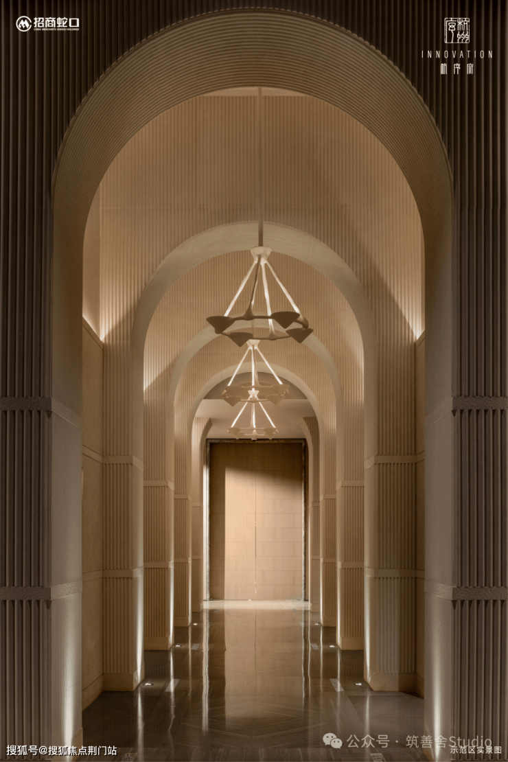 架空层精心打造,携手西泠印社,以书吧、休闲区、会议室为核心文化载体。特色拱圈长廊巧妙连接两侧空间,墙面装饰或为实用书架,或为璀璨发光的石材,亦或为营造度假气息的精致格栅,营造出多元化的空间体验。同时,注重屋顶与地面软装的和谐搭配,提升整体空间美感和舒适度。