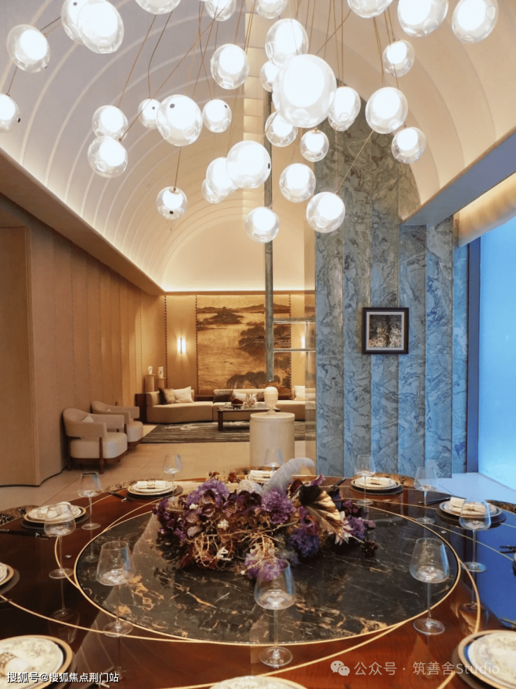 私宴,以撞色绿色石材打造的景墙巧妙划分出休憩与用餐区域,既巧妙掩盖了空间中的柱子,又破解了宽阔空间的单调感。拱券天花与墙面波浪板的和谐呼应,既彰显了空间布局的层次感,又打破了传统对称的僵化。淡雅的硬装色调搭配深邃的中古家具与软装,简约而不失格调,视觉体验清新自然,避免了过度夸张。