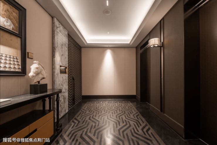 两梯两户+双开门贯通电梯,实际使用起来有近似“两梯一户”居住体验。巨大的电梯厅面积将近13㎡,精装奢石和木纹铝板。