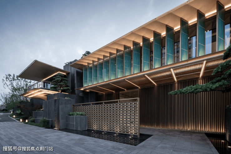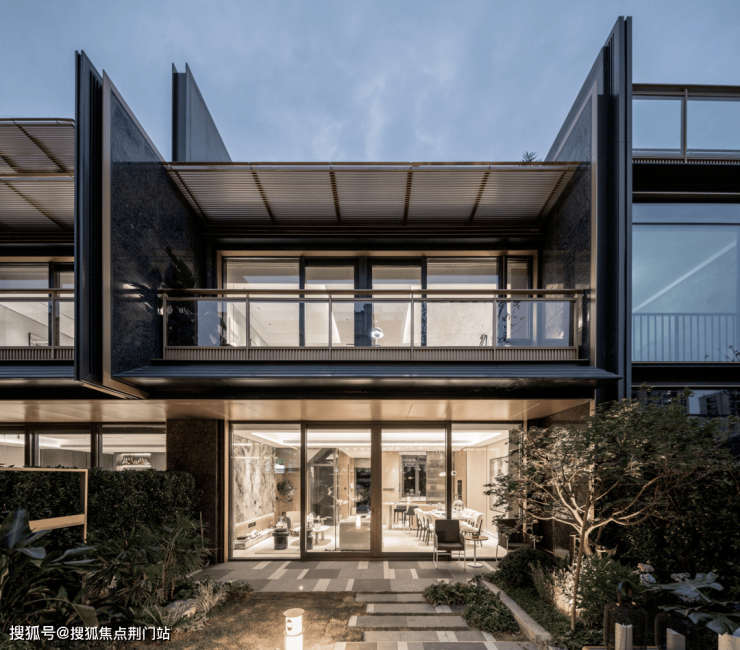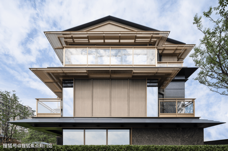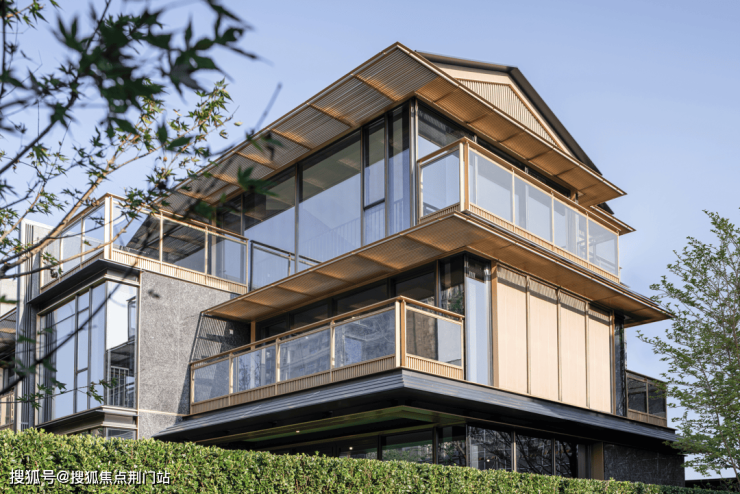 院墅的立面材质选择石材、铝材、玻璃为主体,辅以仿木纹涂料并嵌入发泡陶瓷线条,通过木作样式与木质质感的饰面表现,增添构造的层次感与品质感。