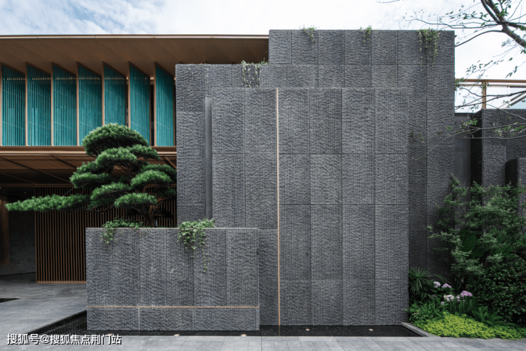 “石”,选择黑金砂是因为我们想要还原画作中的皴染技法。经过光面、毛面、荔枝面、自然面等多轮试样后,最终选择了凿毛拉槽的表面处理方式,来回应自然界的粗粝的山石质感。