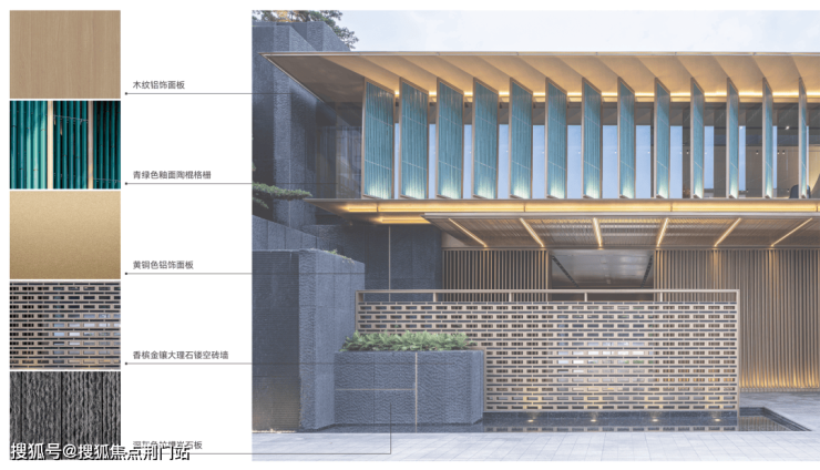 青绿色瓷管经过多轮选材,最大程度保留青瓷的典雅质感,确保在自然光线下呈现温润的意境。金色型材作为点缀,镶嵌于建筑细节中,也增添了视觉层次和精致度。