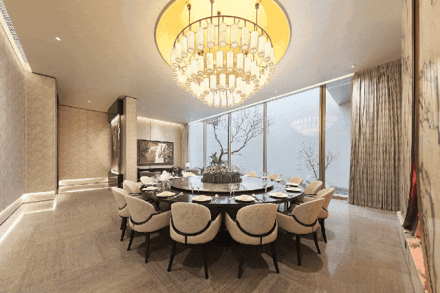 穿门而入,巨大的圆形藻井天幕,令人叹为观止。中庭一株近百年桂花+环形门庭组成了向内的“聚宝盆”,归家的仪式感直接拉满。