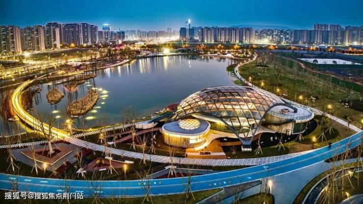 景观设计也匠心独运,整体以《千里江山图》为构园灵感,T型水系贯穿而过,东地块“一轴一环七园”、西地块“二轴五园”,构建量身定制的“江山十二景”。