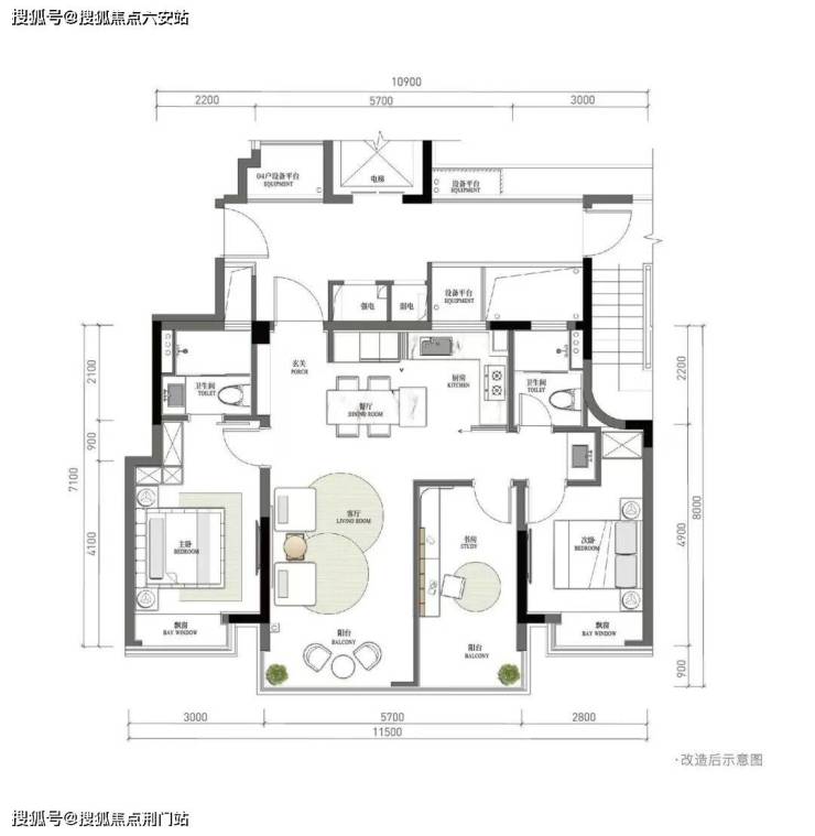 当然,预算更高的可以看看——刚改旗舰边套户型:建面约114方四房两卫。