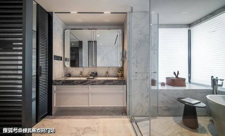 卫浴空间不仅使用频率高,也是体现居住幸福感的重要空间,沄璟主卫做了杜拉维特双台盆,再铺上威尼斯棕的台面,干净整洁的同时,也有美学视觉体验。