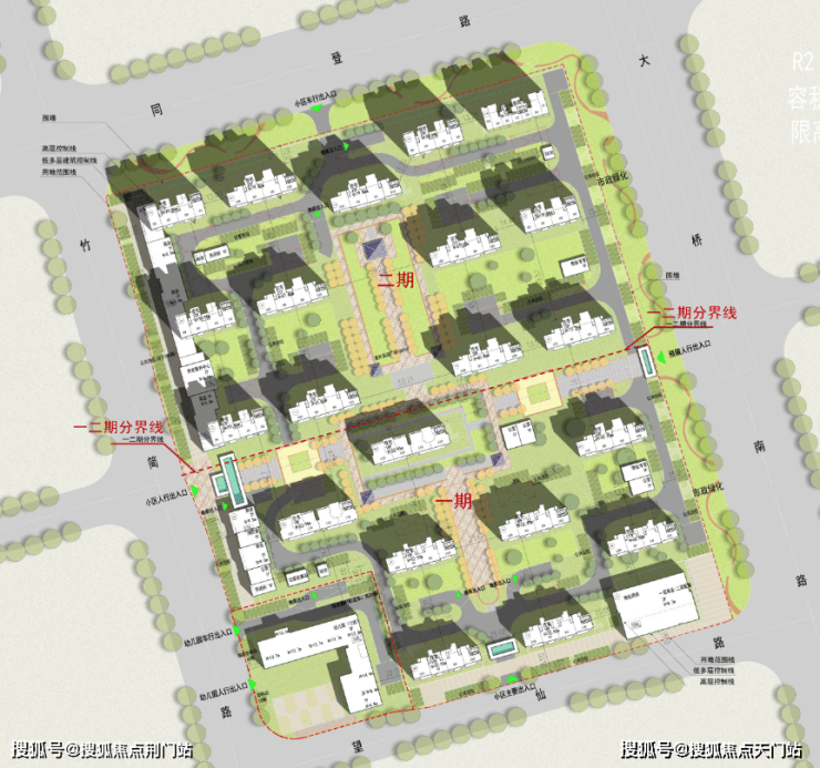 小区以画意筑城·文脉富春为理念,打造东方山水情怀理想人居。整体融合美学与生活功能,形成二轴、三环、四礼七景的空间结构。