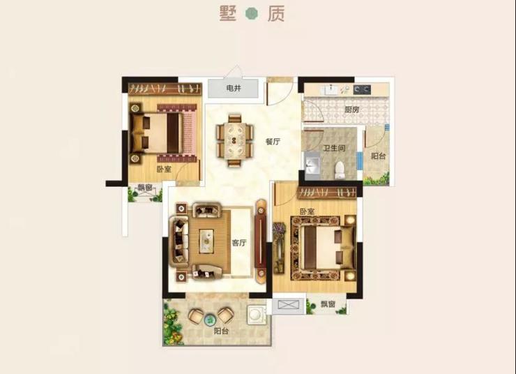 客厅采光良好,阳台宽敞,使居室更加明亮温馨;厨房餐厅紧临,方便快捷;餐客相互联系又明显分区,设计科学,拓展活动空间。