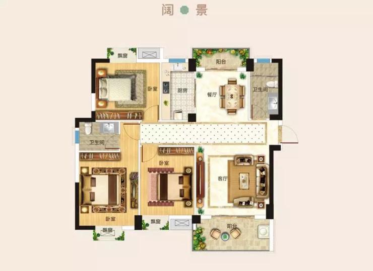 三室都设置有观景飘窗,时刻享受明媚的生活;主卧配置独立卫生间、衣帽间,私密中尽显尊崇荣耀。