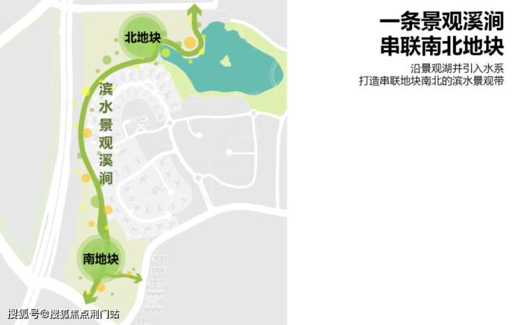 由湖岸会所(北会所)出发,一条景观溪涧引入景观湖“小西湖”水系,打造出串联地块南北的滨水景观带。