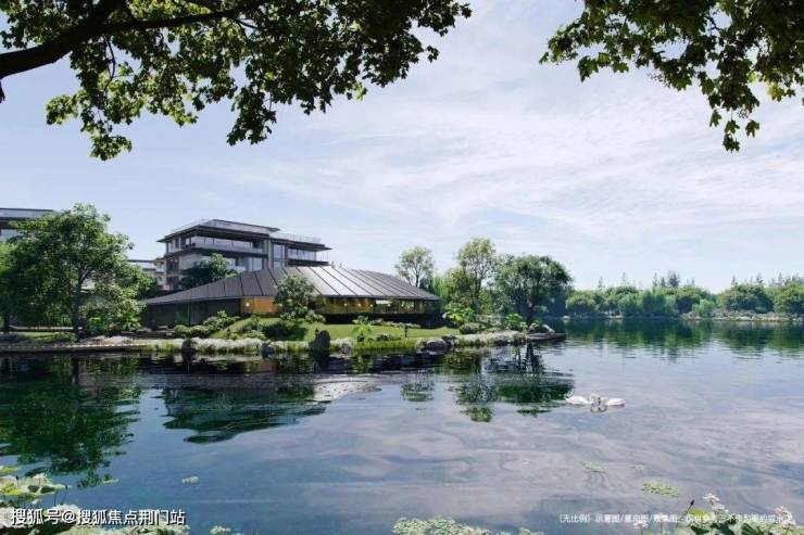 湖岸线上约1100㎡的湖岸会所,一如东方折扇般轻盈展开的艺术感建筑,孤形的大屋檐通透玻璃幕墙、无界水线。
