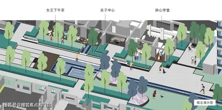 想象下这条「桃李长廊」可以容纳的生活场景,如果从外边回家,顺手生活超市里带点生鲜和蔬菜,也可以去亲子中心里看看玩兴正浓的小朋友,路过「女王下午茶」区,还能和正在跟闺蜜喝茶的太太打声招呼,父亲要是唤你去打局乒乓…