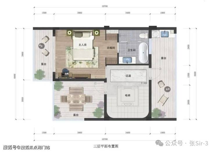 三层 尊崇主人层● 全功能主人层设计,10.7米大开间豪华套房布局,独享尊贵● 东西南3大环景露台,将大幕院景、阳光星辰尽收眼底,一境天地宽